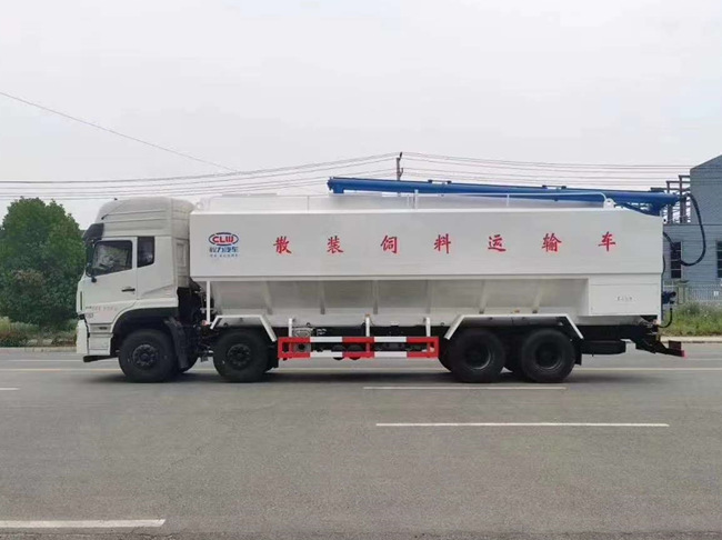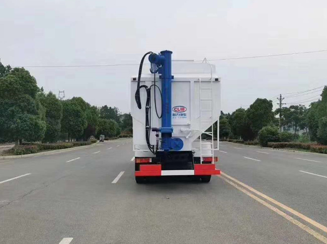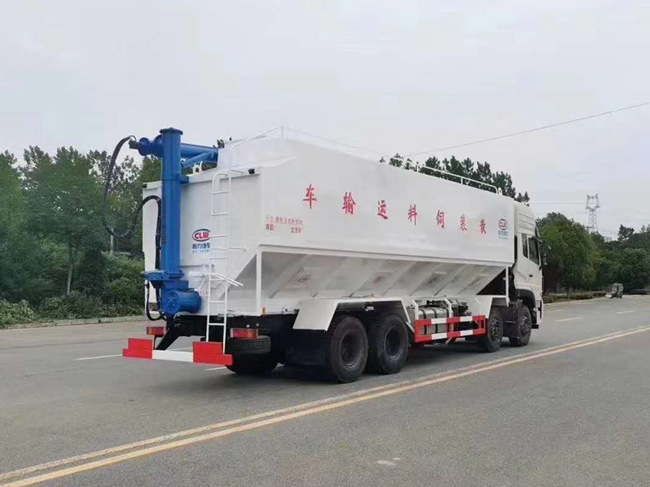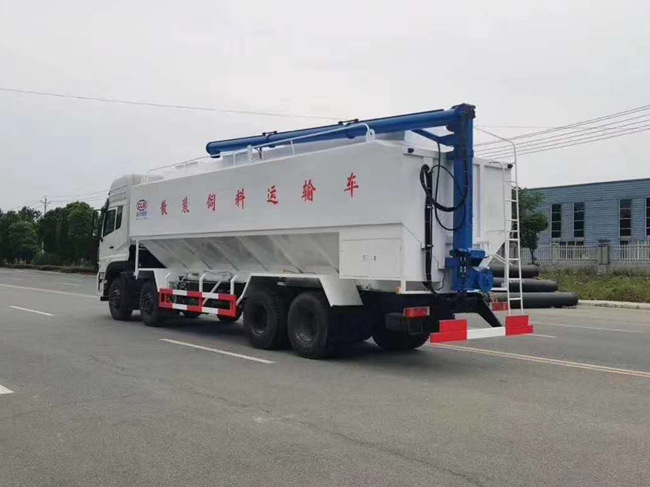 散裝飼料車的飼料罐架設(shè)在卡車的底盤上,罐頂開有進(jìn)料口.頂部的一根螺旋輸送卸料管(俗稱卸料絞龍)則可自由回轉(zhuǎn)和抬升,抬升的仰角可達(dá)60度。運(yùn)輸時(shí),頂部的螺旋管平臥在罐頂;卸料時(shí)則抬起,使管端的出料口與畜禽飼養(yǎng)場貯料罐頂部的進(jìn)料門相接,駕駛室內(nèi)裝有操縱裝置(操縱裝置也可裝置在罐體尾部),卸料時(shí)通過車底的動(dòng)力輸出軸和減速器來驅(qū)動(dòng)螺旋,以完成卸料。目前國內(nèi)主要推出3T、5T、8T、11T、15T和22T等多個(gè)噸位車型。