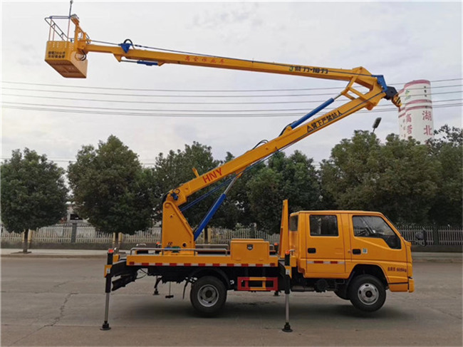 車載式高空作業車移動方便,折臂結構緊湊,強度高、重量輕、直接接入交流電或采用本身直流電源啟動,架設速度快,工作臺即可升高又可水平延伸,還可旋轉,易于跨越障礙物到達工作位置,是高空作業設備。