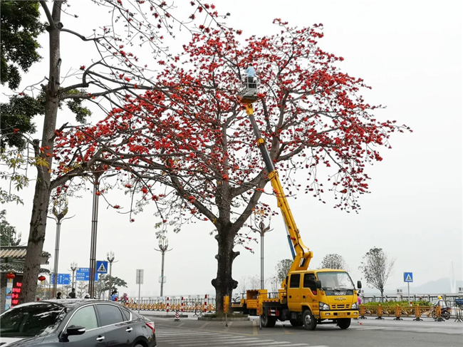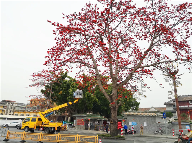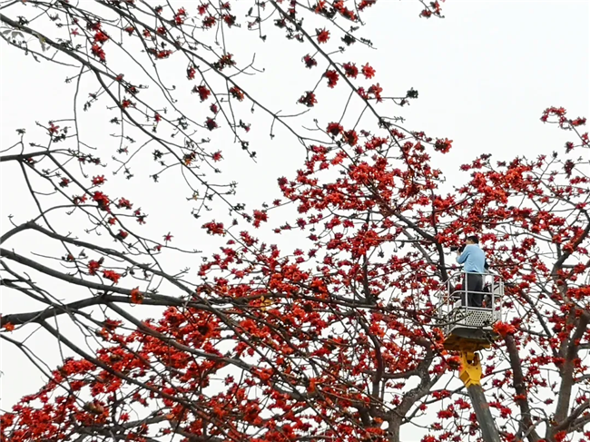 原來(lái),是攝影愛(ài)好者為了拍下美美的木棉花,租下了高空作業(yè)車,與閱江樓門前怒放的紅棉來(lái)個(gè)“近距離接觸”。