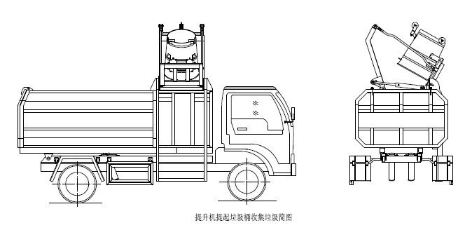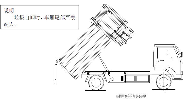 步驟2.將提升操作手柄推至收回位置,箱體右側提升機油缸或頂端上蓋開蓋油缸收回,使提升機帶動垃圾桶向下回落并放置于地面,松開操作手柄使其回到中位,完成一次載,然后松開取力器,該車可以運輸行駛。另注意:箱體內若加裝小刮板,請按操作指示牌的方向推動手柄,使刮板推出,將箱體前端的垃圾推刮到箱體后部,并且在再次裝載垃圾前將手柄反向拉回,使刮板收回,手柄回中位;以防止垃圾倒入刮板和箱體前端而被卡住;若箱體內沒有加裝小刮板,為防止垃圾僅僅裝在箱體前端,這時可將自卸操作手柄推至開啟位置,箱體底部自卸油缸伸出,使箱體繞自卸翻轉座旋轉舉起一定角度,使箱體前端的垃圾因自重而滑到箱體后部,完成后將操作手柄反向拉回或回中位,箱體下落放平松開手柄。