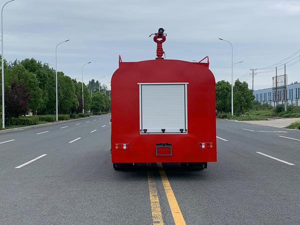 1)消防車功能:該車安裝了后置式消防泵,工作壓力在1.0 Mpa,在發(fā)生為災(zāi)時啟動消防泵,關(guān)閉灑水功能閥門,操作消防炮,射程達(dá)55米以上,消防炮流量大,射程遠(yuǎn),即可滅火。